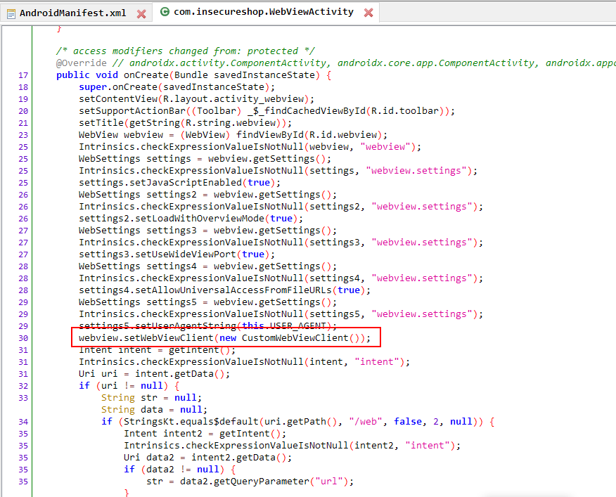 Checking the code above, we can see that WebViewActivity uses a CustomWebViewClient() object. Examining this class reveals the following block of code: