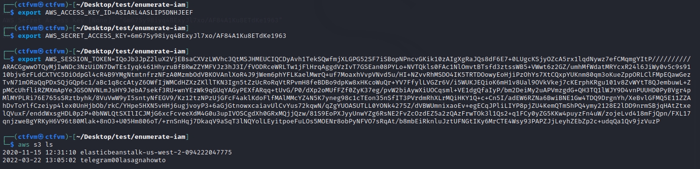 An interesting permission that we have is that we can list the s3 buckets. For it to work, we need to configure our credentials (Iβm using new creds here, I may have messed something up earlier):