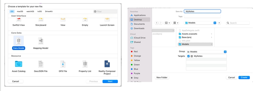 Choose File →New →File and select the iOS platform tab. Scroll down to the Core Data section, select Data Model, and click Next and save it to desired directory. Let’s save it in Models folder.