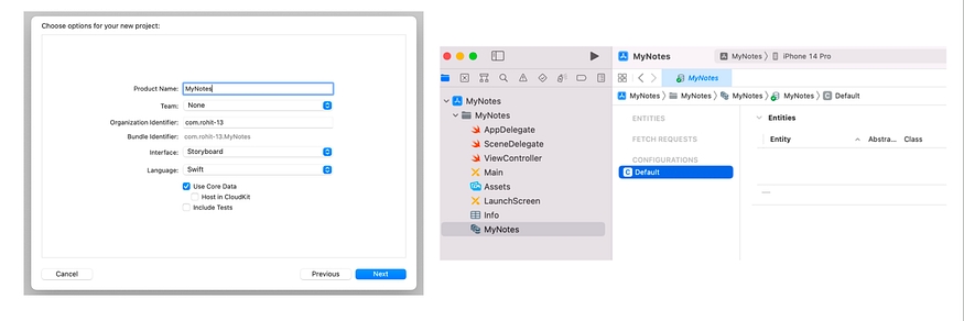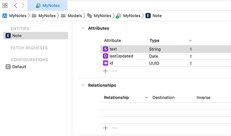 The first step in working with Core Data is to create a data model file to define the structure of your app’s objects, including their object types, properties, and relationships. You can add a Core Data model file to your Xcode project when you create the project, or you can add it to an existing project. Let’s build a core data model for a notes app.