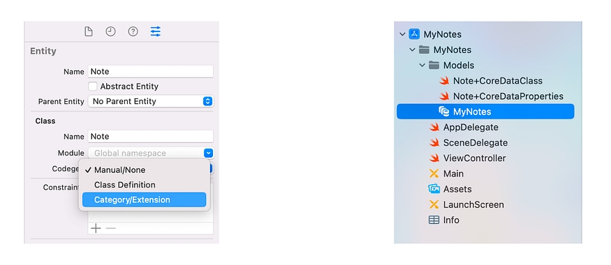 The Xcode will generate two files CoreDataClass and CoreDataProperties. CoreDataProperties file is sort of the representation of our data model(entity) which will have attributes and relationship property. CoreDataClass is a class that is available to us extend or add some properties to the Note class.